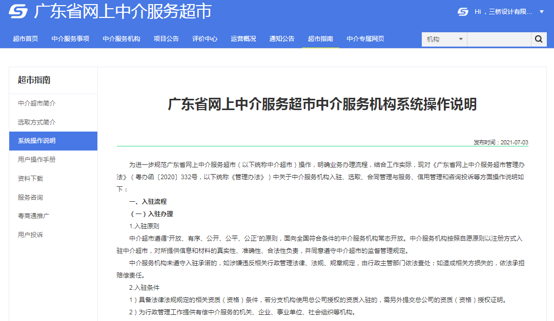 廣東省網上中介服務超市是由省統一規劃、統一建設、統一部署,是全省各類有關中介服務網上交易的綜合性信息化服務和信用管理平臺,為項目業主購買中介服務、中介服務機構承接中介服務項目行業主管部門對相關單位和人員實施監管提供服務。